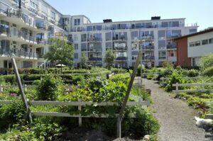 Ще одна часта проблема дворів — автомобілі. Через те, що мешканці залишають машини під будинком, формується непривітний і небезпечний простір, де не хочеться перебувати зайвий раз. Рішення цієї проблеми — втілення концепції «двір без машин». Вона пропонує винесення паркувальних місць на зовнішній бік будинку, щоб зробити двори безпечними місцями, де приємно проводити час.