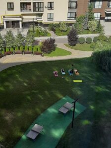 У дворі містянки доглянута територія, дитячий і тренажерний майданчики, тенісни столи і багато рослин. Скрізь стоять домофони і камери спостереження. На території двору автомобілі під забороною — задля безпеки, в першу чергу, дітей. Паркінг та парковка знаходяться поряд із будинком.