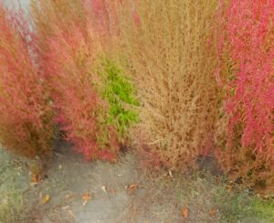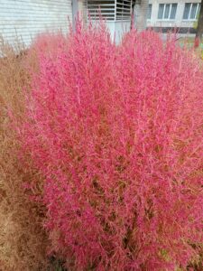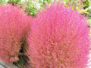 Літній кипарис (кохія) змінив свою одежу з яскраво салатової на малинову, і його пухнасті кульки ніжно тримтять на легкому вітерці.