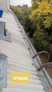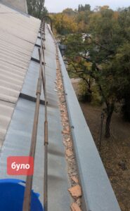 Тут дах де-інде зяяв дірками, коник був пошкоджений, зливні короби засмічені, водоприймальники поломані.