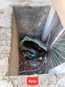 Глибокі приямки в цоколі будинків дуже швидко засмічуються. Вітер наносить в них купу опалого листя і сміття. Та й люди додають, лінуючись дійти до смітника чи урни.