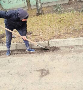 Після зими усі дороги під бордюрами в нашаруванні землі, а само полотно — в протиожеледному відсіві. Чистимо підбордюр’я, вимітаємо відсів.